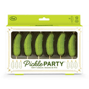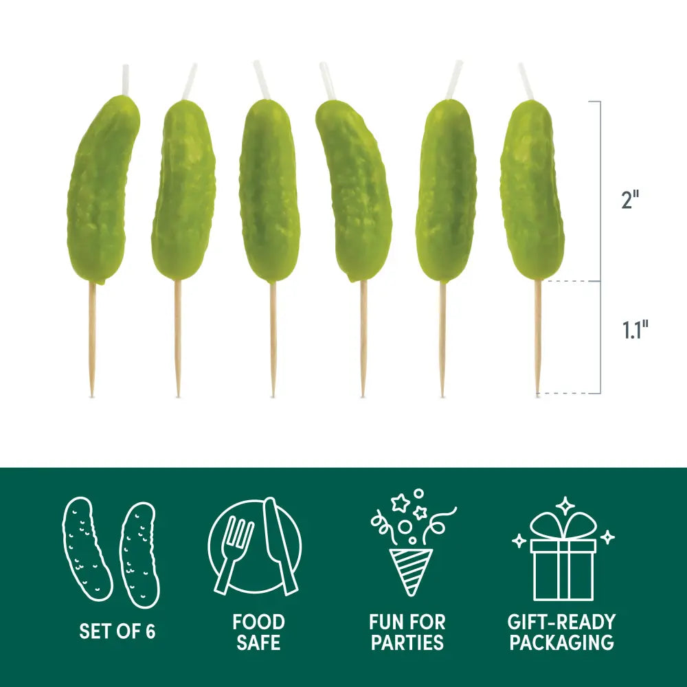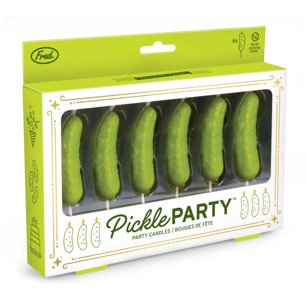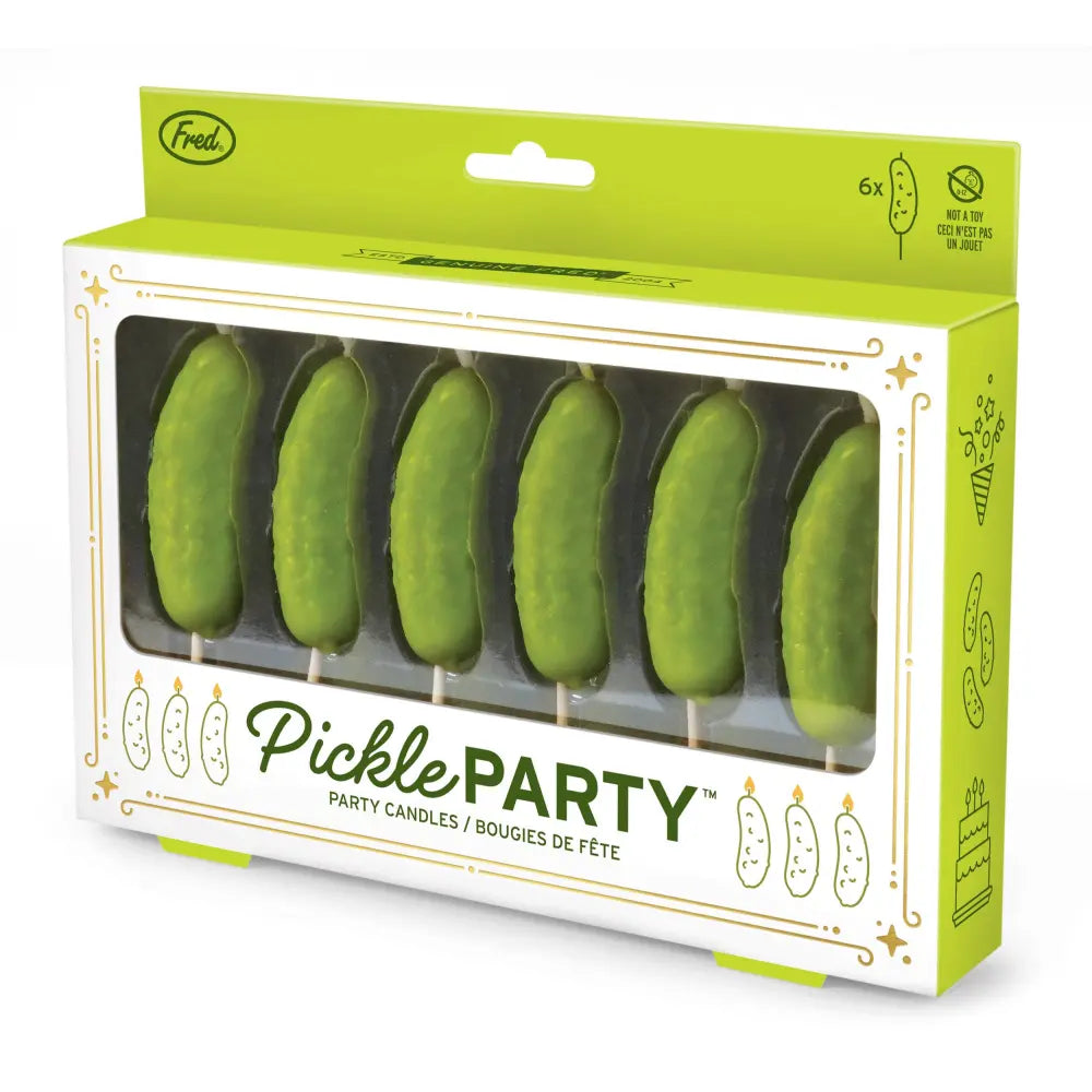Relish the moment with Fred’s Pickle Party candles! These six dill-ightful pickle-shaped candles are here to brine bright and add quirky charm to your cake. Each pickle measures approximately 2” tall and is attached to a wooden pick for easy placement.