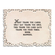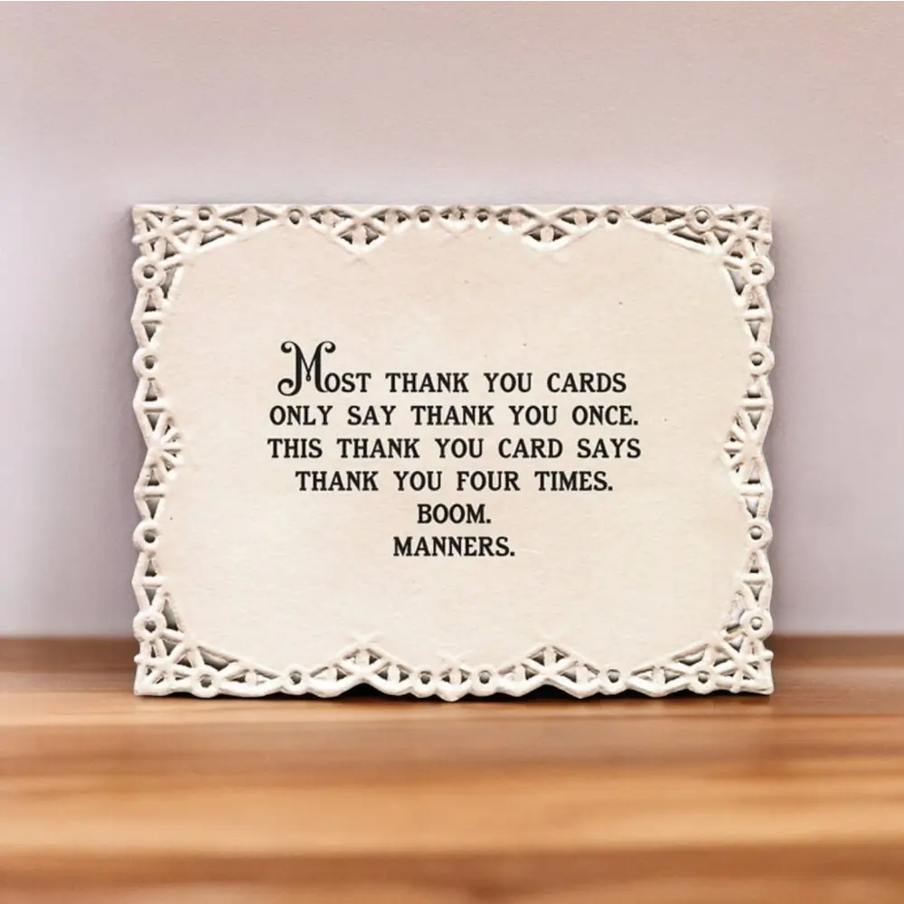 Be an overachiever and send this vintage-inspired thank you card: "Most thank you cards only say thank you once. This thank you card says thank you four times. Boom. Manners."