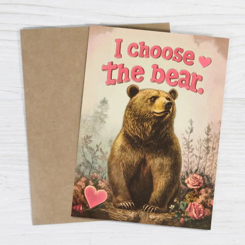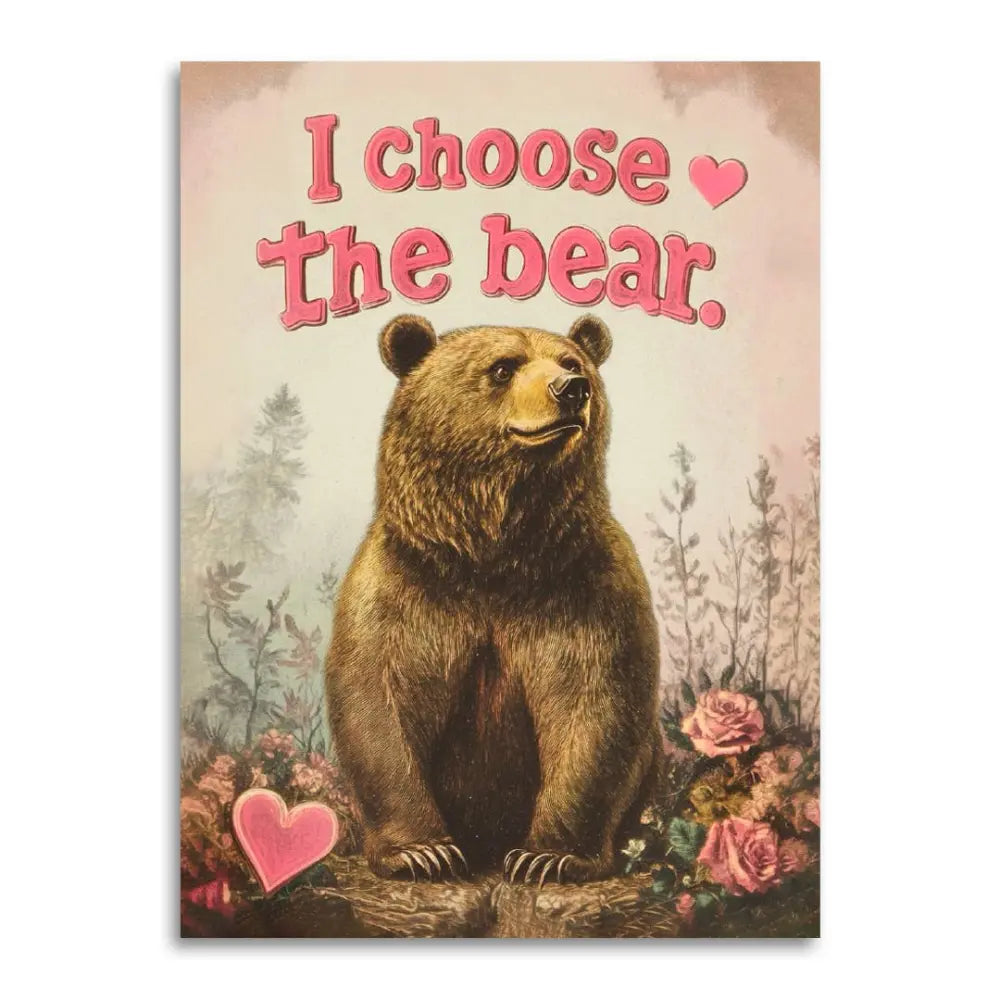 Celebrate women’s empowerment and camaraderie with our "I Choose the Bear" greeting card! Featuring a charming vintage illustration of a giant grizzly bear surrounded by pink hearts, this card humorously responds to the question, “Would you rather be alone in the woods with a man or a bear?” It’s a fun way to spark conversations about strength, choices, and solidarity among women.