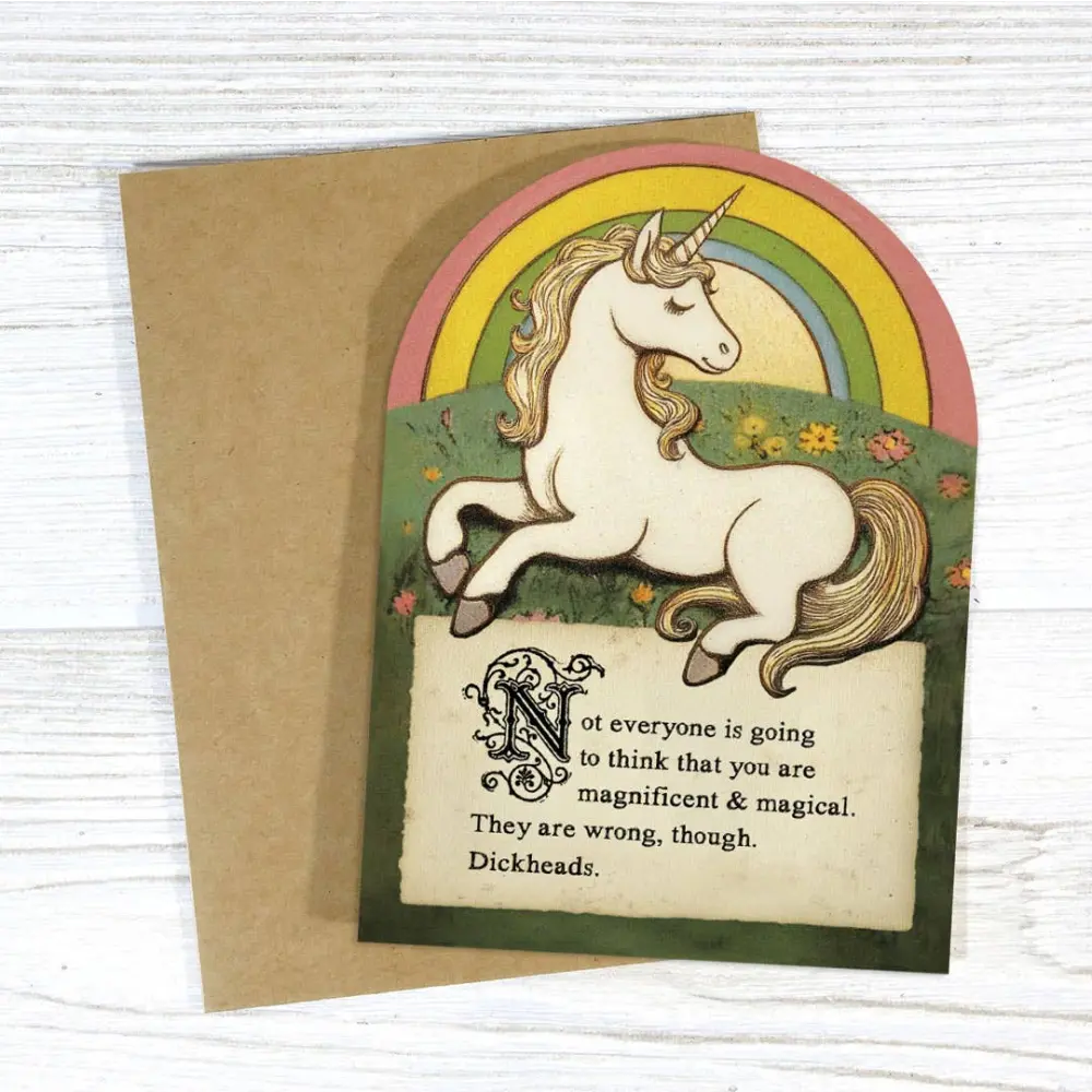 Made to hype someone up — a blunt, funny boost for friends who need a reminder they’re awesome. The card reads: "Not everyone is going to think you are magnificent & magical. They are wrong, though. Dickheads." Featuring a vintage unicorn and rainbow illustration that evokes warm, nostalgic vibes, this card strikes the perfect balance of sweet and savage.