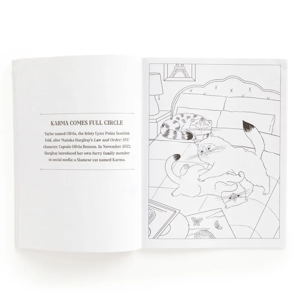 Karma Is Three Cats: A Taylor Swift-Inspired Coloring Book Starring Meredith, Olivia & Benjamin Dive whiskers-first into the colorful lives of the world’s most famous felines with Karma Is Three Cats, a delightfully sassy coloring book featuring Taylor Swift’s iconic kitty trio—Meredith Grey, Olivia Benson, and Benjamin Button.