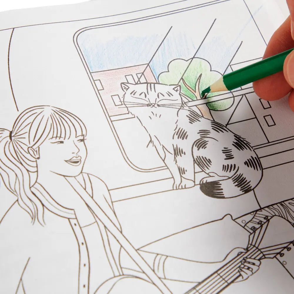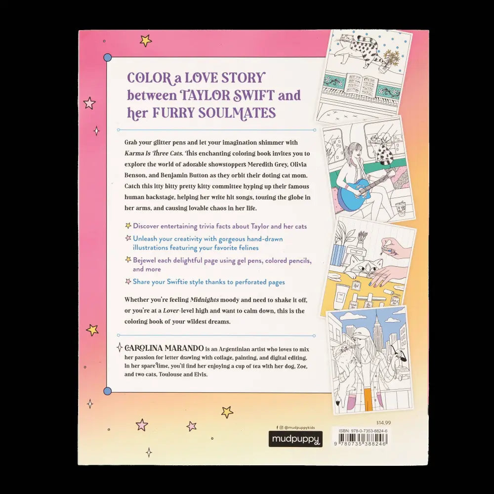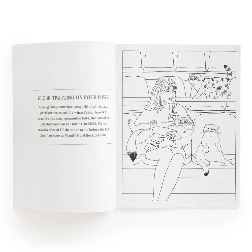 COLOR THEIR WORLD Bring to life playful illustrations of Taylor’s beloved cats in all their glory—from naps on glittery guitars to backstage moments on tour. Whether they’re curled up in a spotlight or causing a lyrical catastrophe, every page is a tribute to their larger-than-life personalities.