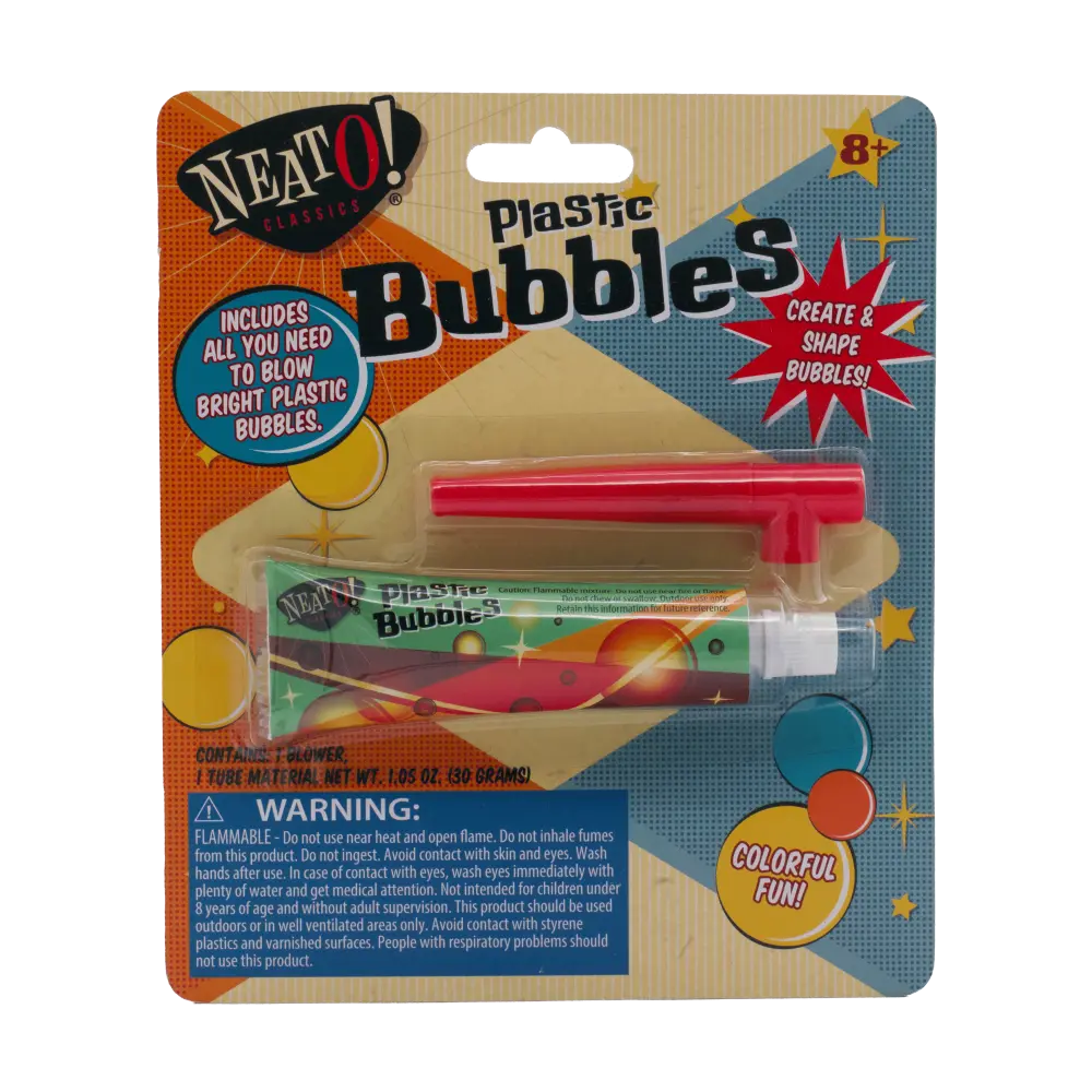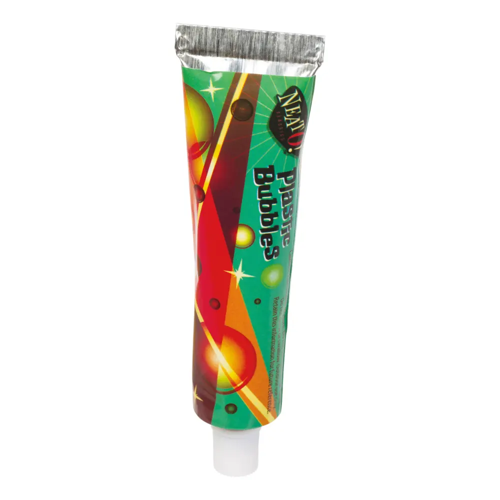 This creative bubble toy comes with a plastic blower straw, tube key, and 1 tube of plastic bubble material.