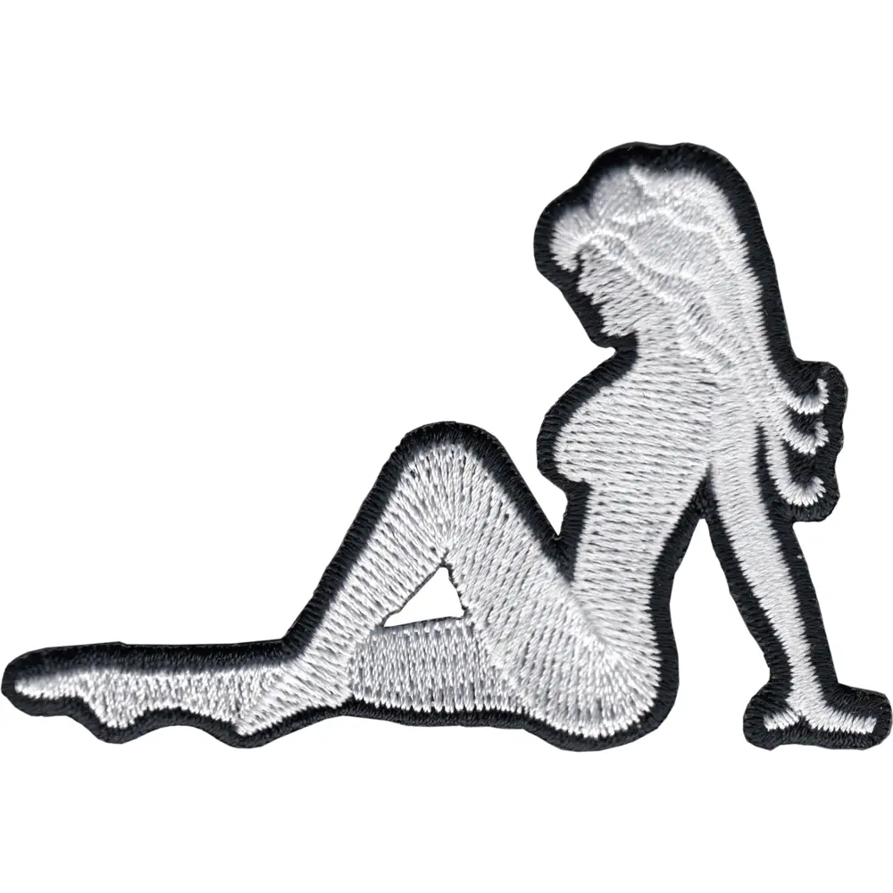 Measuring 3 inches wide by 2 inches tall, the design is stitched in silver and black with clean cut-out edges, capturing the legendary reclining pose made famous on big rig mudflaps across the country.