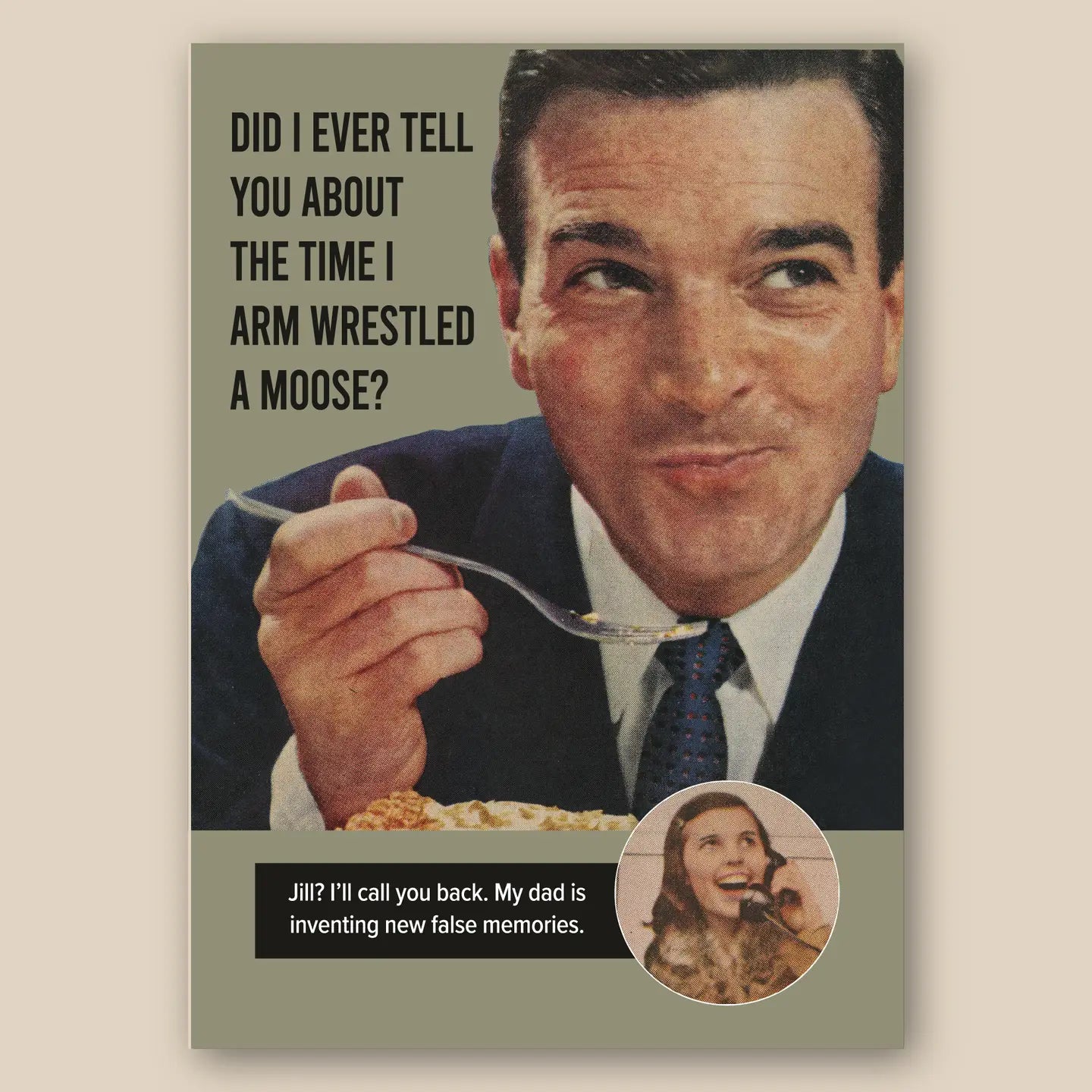 Did I ever tell you about that time I arm wrestled a moose? Jill? I'll call you back. My dad is inventing new false memories.
