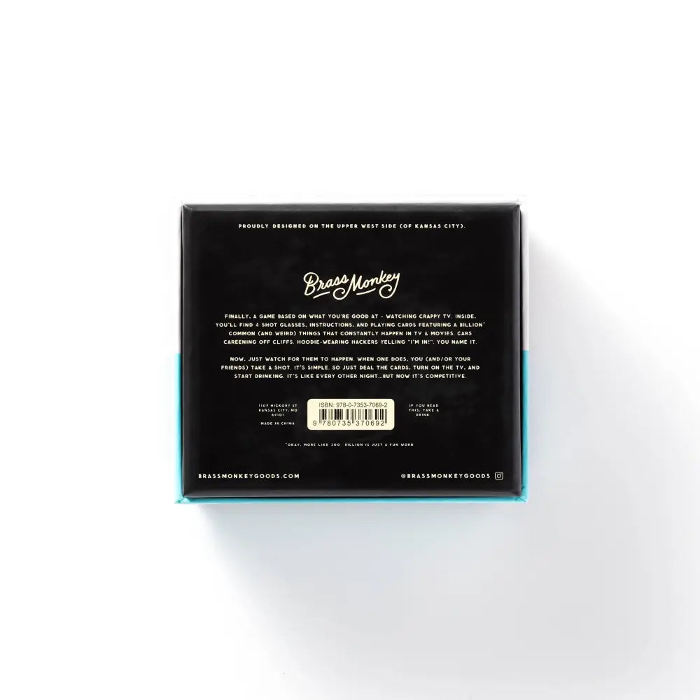 This drinking game by Brass Monkey includes four shot glasses, an instruction sheet, and 100 cards that describe the common (& weird) things that always happen in TV & movies.
