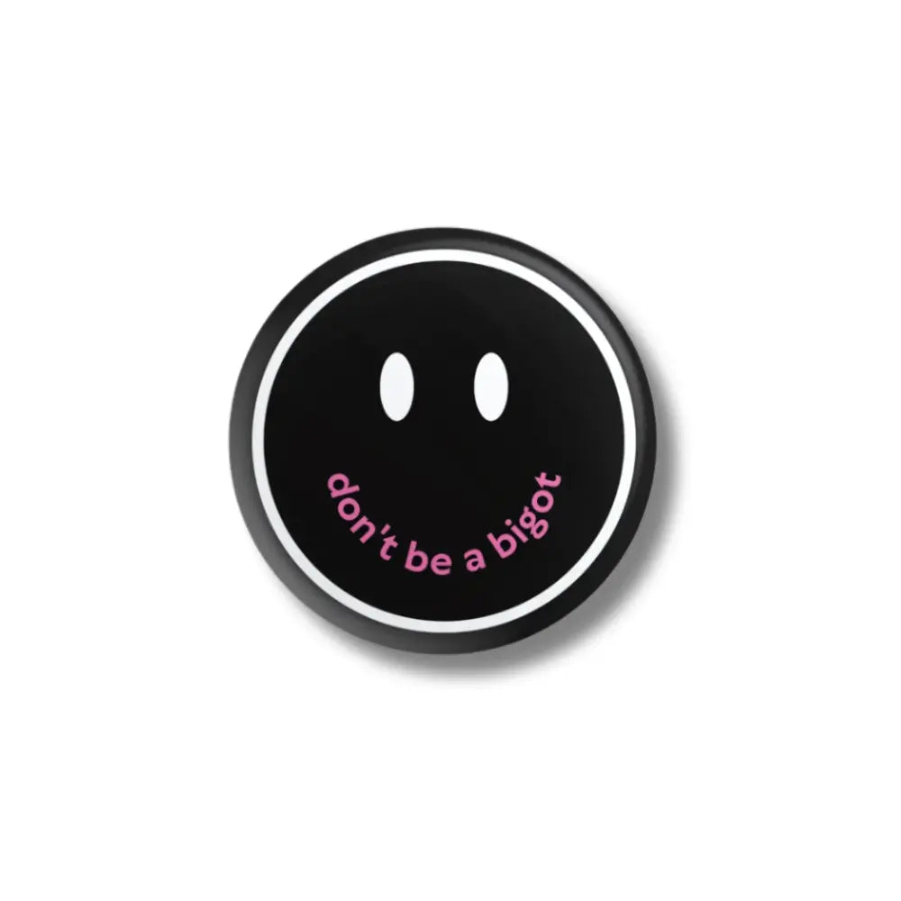 Smiley face pin with "Don't be a bigot" smile.